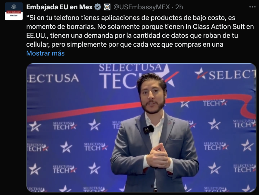 La Embajada de Estados Unidos en México lanzó una advertencia contra aplicaciones como Shein, Temu, AliExpress y Alibaba, acusándolas de recopilar datos de los usuarios y afectar negativamente a las industrias locales.