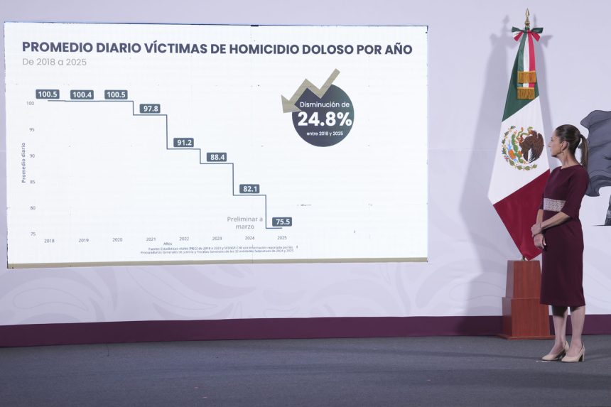 El reporte expuesto mostró una reducción del 14% en homicidios dolosos a nivel nacional entre septiembre de 2024 y marzo de 2025, al pasar de 86.9 a 74.7 víctimas por día. Siete estados concentran más de la mitad de los homicidios: Guanajuato, Baja California, Estado de México, Chihuahua, Sinaloa, Guerrero y Jalisco.