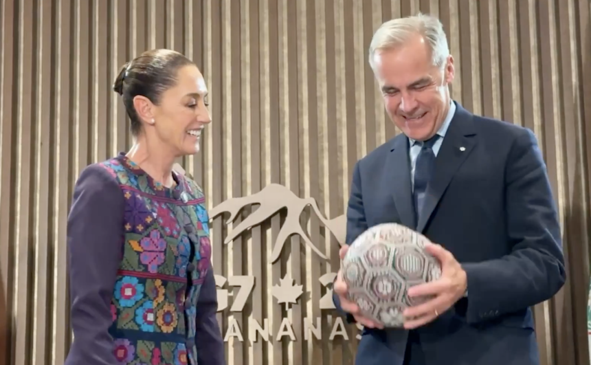 En los pasillos de la Cumbre del G‑7, Claudia Sheinbaum quiso ir más allá de los saludos protocolarios. La presidenta mexicana se acercó al primer ministro canadiense, Mark Carney, con un obsequio que hablaba por sí solo: un balón artesanal tejido por manos wixárikas. “Es nuestro símbolo de amistad y de la fiesta que el fútbol nos unirá el próximo año”, explicó, mientras el mandatario anfitrión lo describía como “fantástico”.